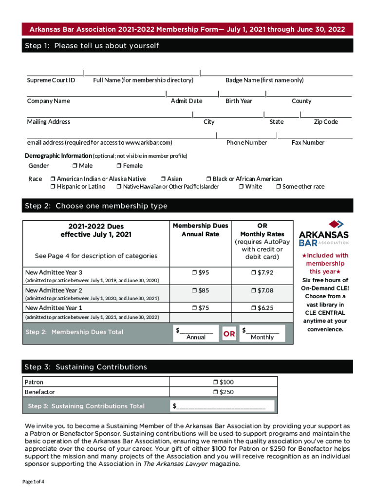 Arkansas Bar Association 20212022 Membership Form July 1, 2021, through June 30, 2022Step 1: Please tell us about yourself Supreme Court Full Name (for membership directory)Badge Name (first name