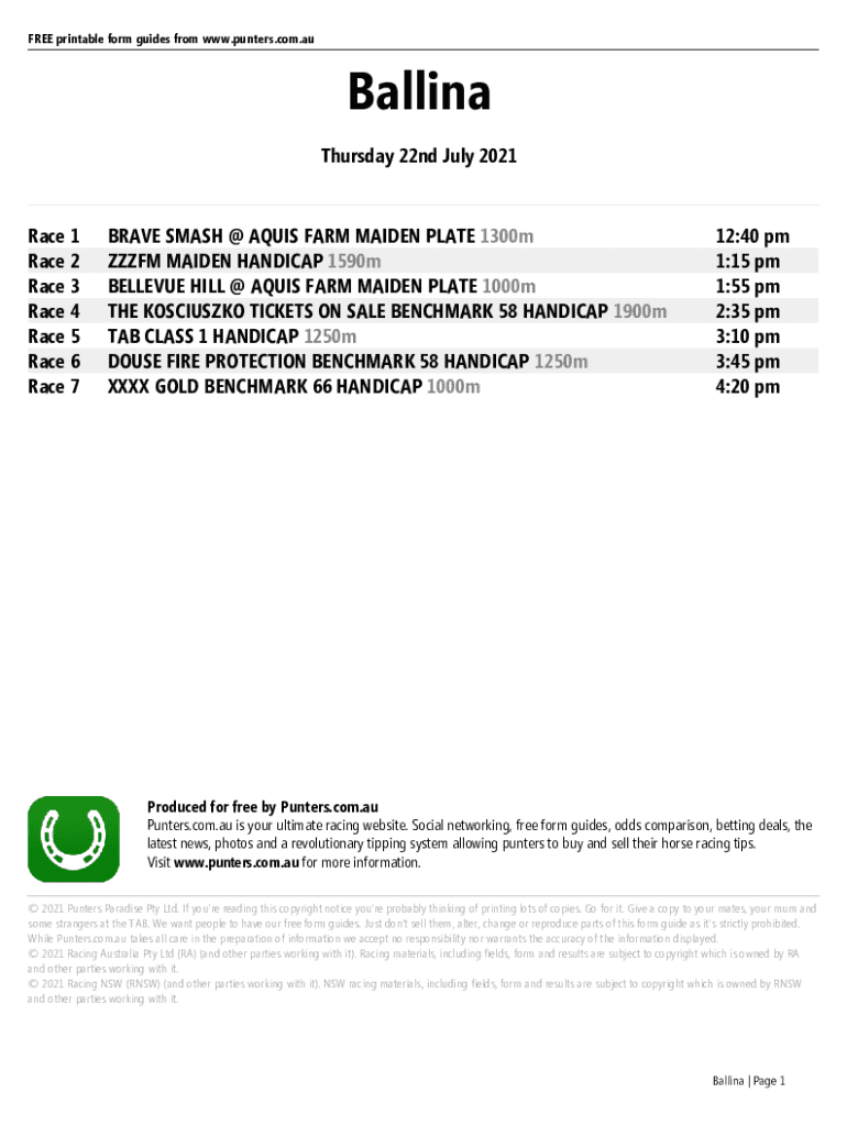 FREE printable form guides from www.punters.com.auBallina Thursday 22nd July 2021Race 1 Race 2 Race 3 Race 4 Race 5 Race 6 Race 7BRAVE SMASH AQUAS FARM MAIDEN PLATE 1300 m ZZZ FM MAIDEN HANDICAP