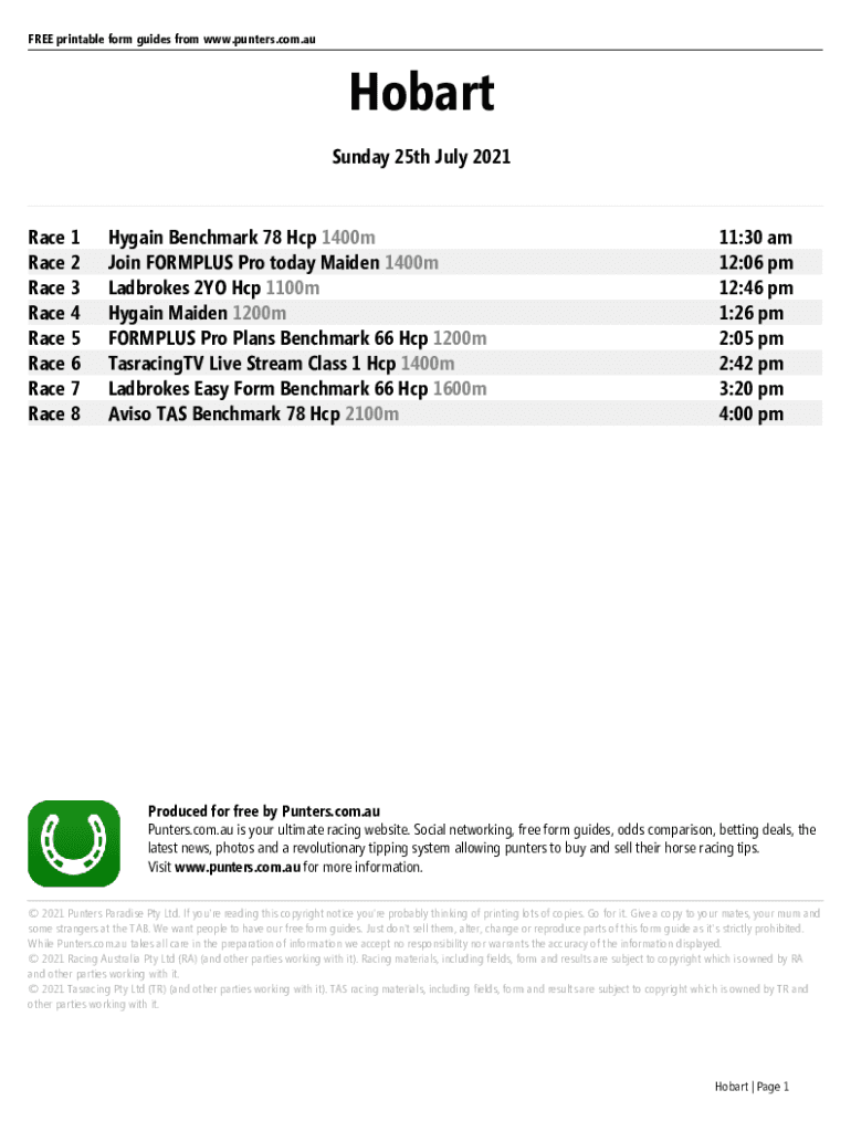 FREE printable form guides from www.punters.com.auHobart Sunday 25th July 2021Race 1 Race 2 Race 3 Race 4 Race 5 Race 6 Race 7 Race 8Hygain Benchmark 78 HCP 1400 m Join FORMULAS Pro today Maiden