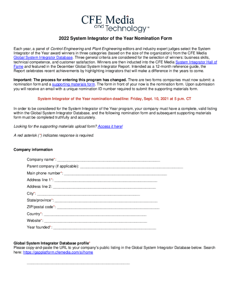 2022 System Integrator of the Year Nomination Form Each year, a panel of Control Engineering and Plant Engineering editors and industry expert judges select the System Integrator of the Year award
