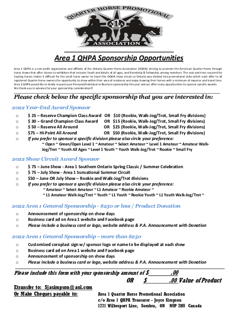 Area 1 HPA Sponsorship Opportunities Area 1 HPA is a nonprofit organization and affiliate of the Ontario Quarter Horse Association (OSHA) striving to promote the American Quarter Horse through horse
