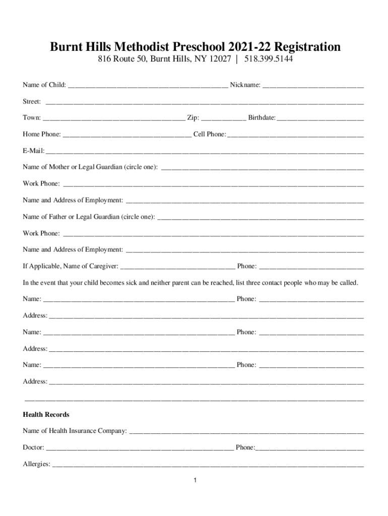 Burnt Hills Methodist Preschool 202122 Registration 816 Route 50, Burnt Hills, NY 12027 518.399.5144 Name of Child: Nickname: Street: Town: Zip: Birthdate: Home Phone: Cell Phone: Email: Name of Mother