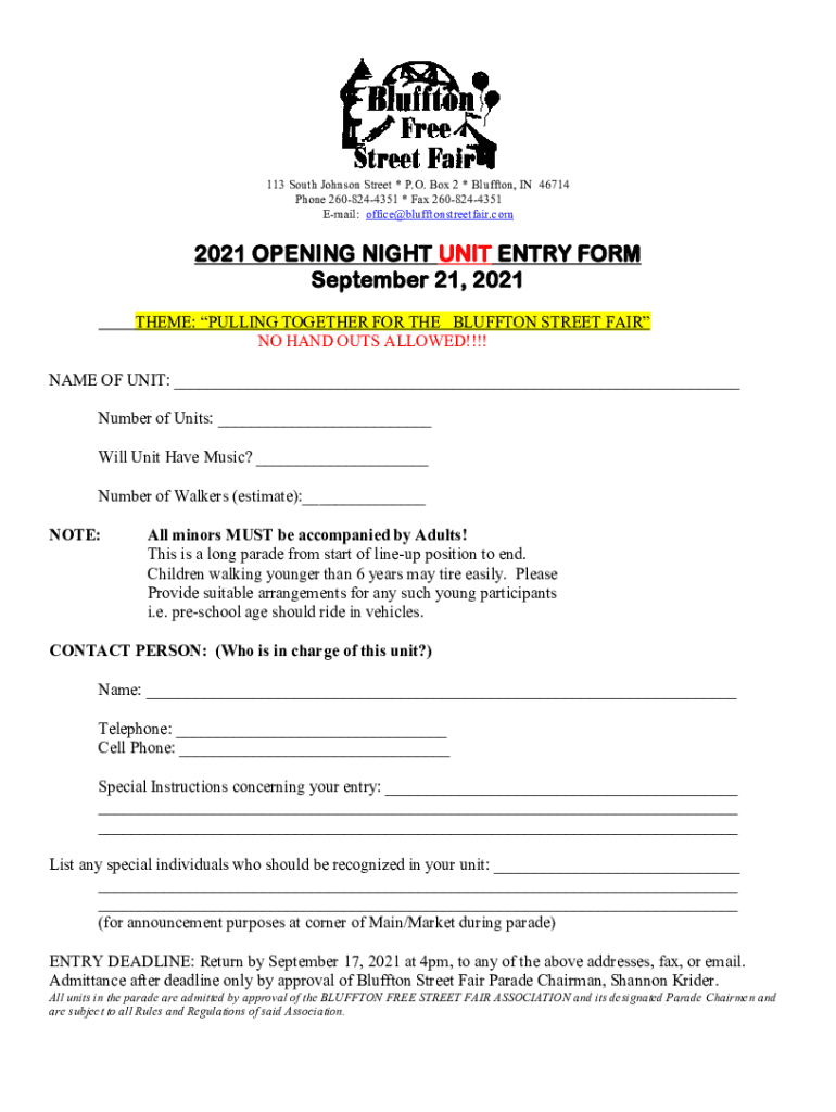 113 South Johnson Street * P.O. Box 2 * Bluffton, IN 46714 Phone 2608244351 * Fax 2608244351 Email: office blufftonstreetfair.com2021 OPENING NIGHT UNIT ENTRY FORM September 21, 2021, THEME: PULLING