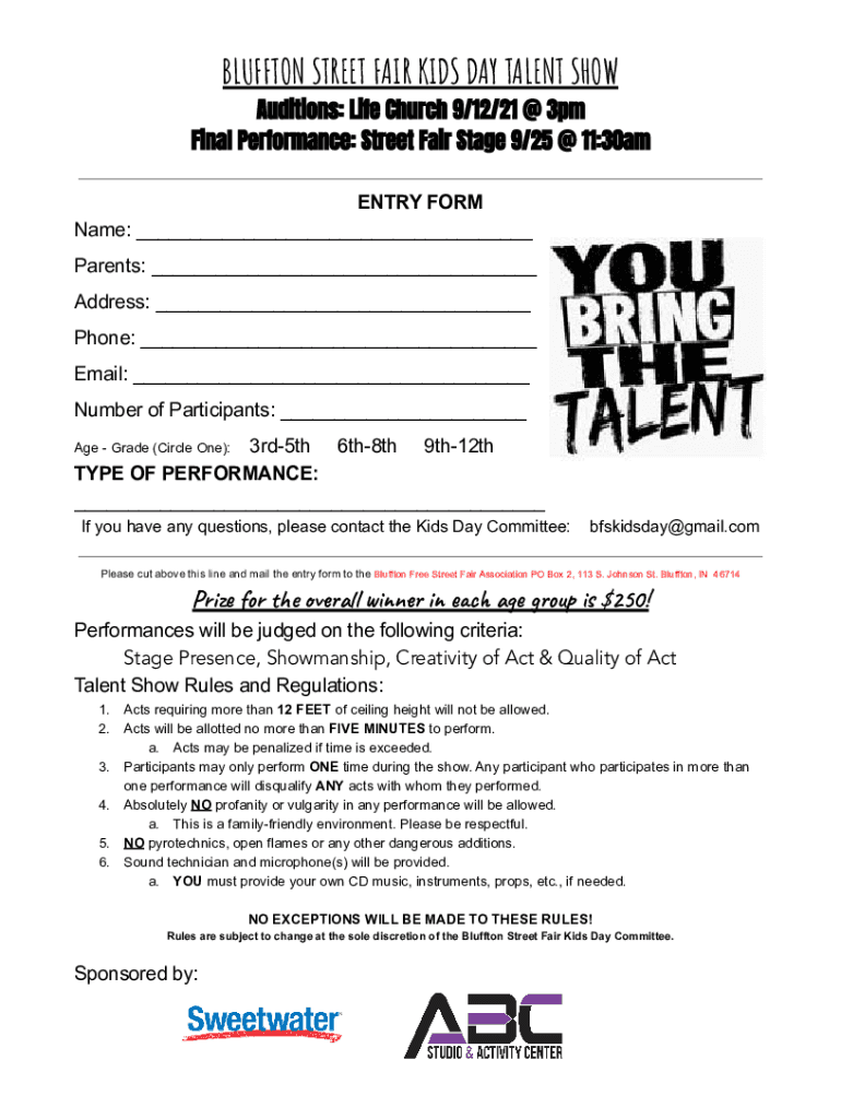 BLUFFTON STREET FAIR KIDS DAY TALENT SHOW Auditions: Life Church 9/12/21 3pm Final Performance: Street Fair Stage 9/25 11:30am ENTRY FORM Name: Parents: Address: Phone: Email: Number of Participants: