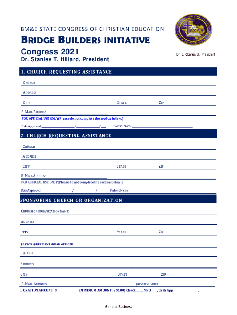 BME STATE CONGRESS OF CHRISTIAN EDUCATIONBRIDGE B BUILDERS INITIATIVE Congress 2021Dr. B. R. Daniels, Sr., President Dr. Stanley T. Hillary, President 1. CHURCH REQUESTING ASSISTANCE CHURCH ADDRESS