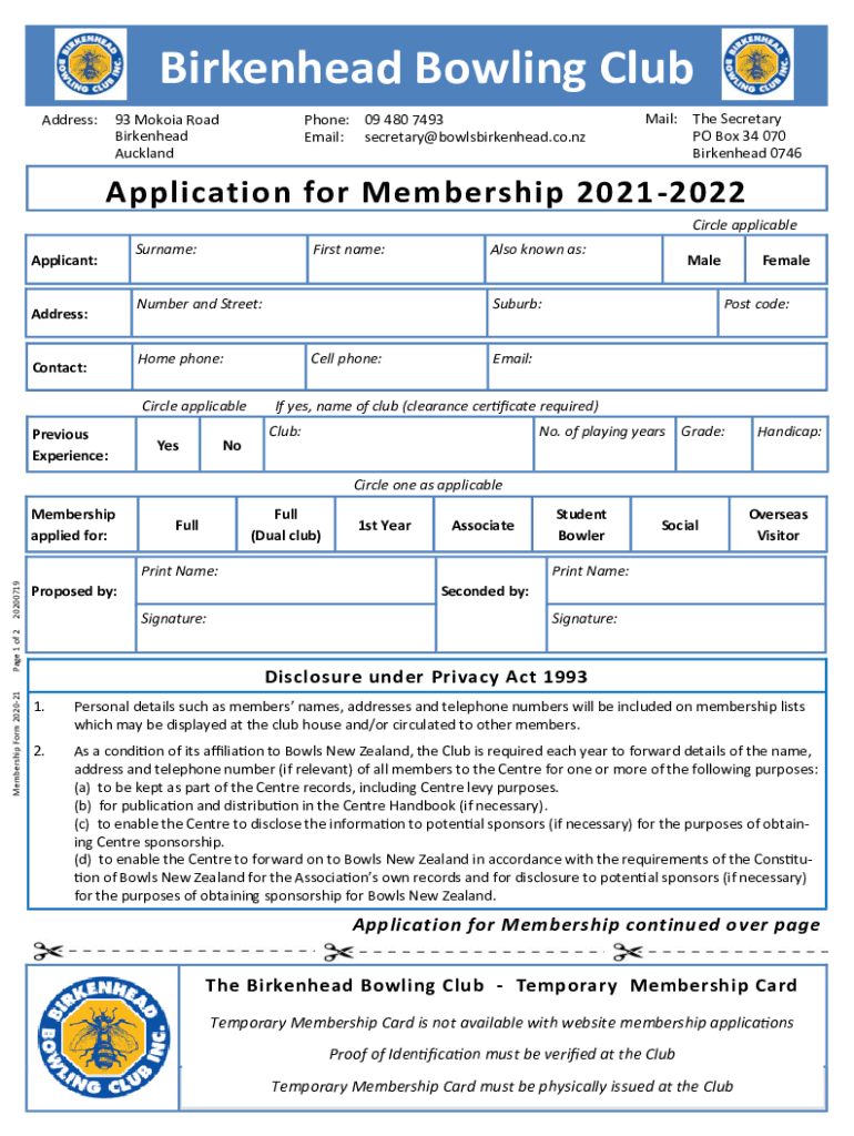 Birkenau Bowling Club Address:93 Nokia Road Birkenau AucklandPhone: 09 480 7493 Email: secretary@bowlsbirkenhead.co.nzMail: The Secretary PO Box 34 070 Birkenau 0746Application for Membership 2021