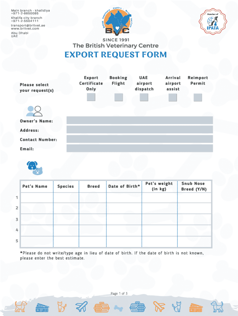 Main branch Khalid +97126650085 Khalifa city branch +97125504111 transport@britvet.ae www.britvet.com Abu Dhabi Remember since 1991The British Veterinary CentreEXPORT REQUEST FORM Export Certificate