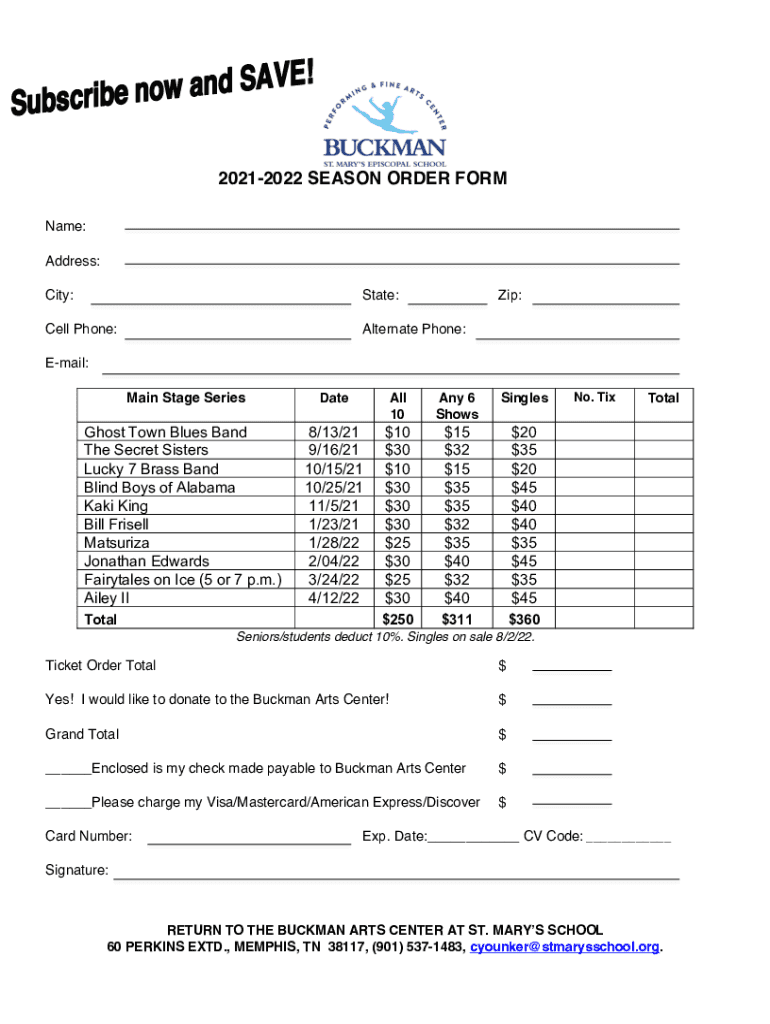 20212022 SEASON ORDER FORM Names: Address: City:State:Zip:Cell Phone:Alternate Phone:Email: Main Stage SeriesDateAll 10Any 6 ShowsSinglesGhost Town Blues Band The Secret Sisters Lucky 7 Brass Band