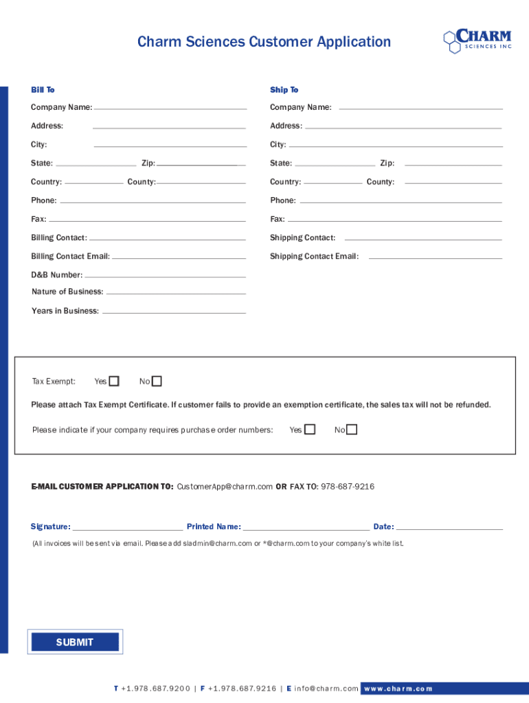 Charm Sciences Customer Application Bill Ship Company Name:Company Name:Address:Address:City:City:State:Zip:Country:State:County:Zip:Country:County:Phone:Phone:Fax:Fax:Billing Contact:Shipping Contact:Billing
