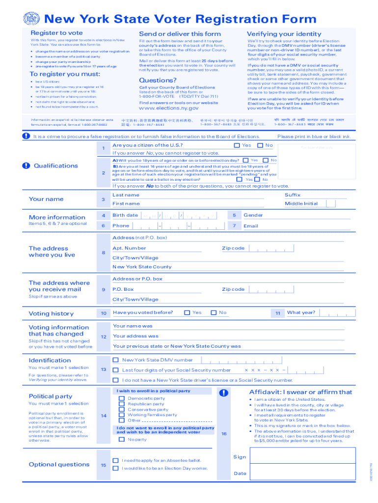 New York State Voter Registration Form Register to voted or deliver this formVerifying your identityWith this form, you register to vote in elections in New York State. You can also use this form