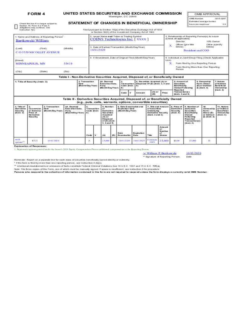 UNITED STATES SECURITIES AND EXCHANGE COMMISSIONER 4OMB Number:32350287Estimated average understatement OF CHANGES IN BENEFICIAL OWNERSHIPCheck this box if no longer subject to Section 16. Form 4