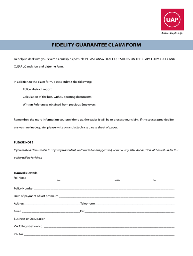 FIDELITY GUARANTEE CLAIM FORM To help us deal with your claim as quickly as possible PLEASE ANSWER ALL QUESTIONS ON THE CLAIM FORM FULLY AND CLEARLY, and sign and date the form. In addition to the