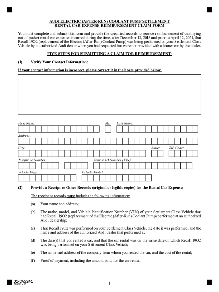 AUDI ELECTRIC (AFTER RUN) COOLANT PUMP SETTLEMENT RENTAL CAR EXPENSE REIMBURSEMENT CLAIM FORM You must complete and submit this form and provide the specified records to receive reimbursement of qualifying