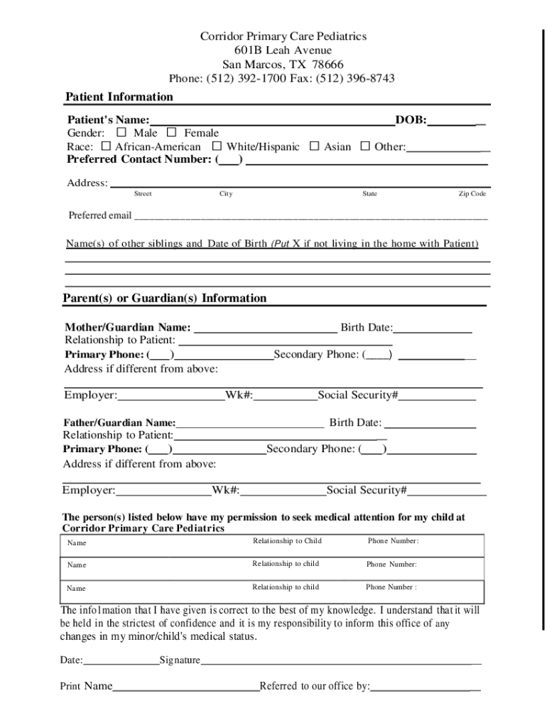 Corridor Primary Care Pediatrics 601B Leah Avenue San Marcos, TX 78666 Phone: (512) 3921700 Fax: (512) 3968743Patient Information Patient's Name: Gender: Male Female Race: African American White/Hispanic