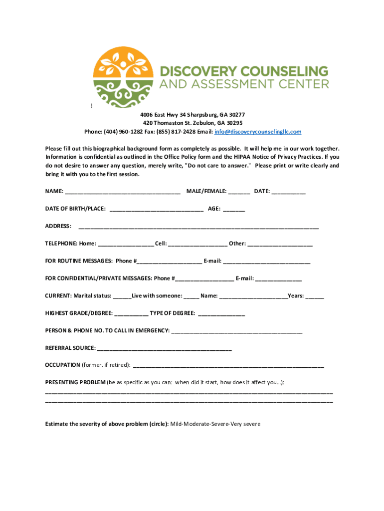 ! 4006 East Hwy 34 Sharpsburg, GA 30277 420 Thomaston St. Zebulon, GA 30295 Phone: (404) 9601282 Fax: (855) 8172428 Email: info discoverycounselingllc.com Please fill out this biographical background