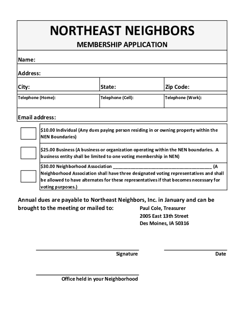 NORTHEAST NEIGHBORS MEMBERSHIP APPLICATION Name: Address: City:State:Zip Code:Telephone (Home):Telephone (Cell):Telephone (Work):Email address: $10.00 Individual (Any dues paying person residing in