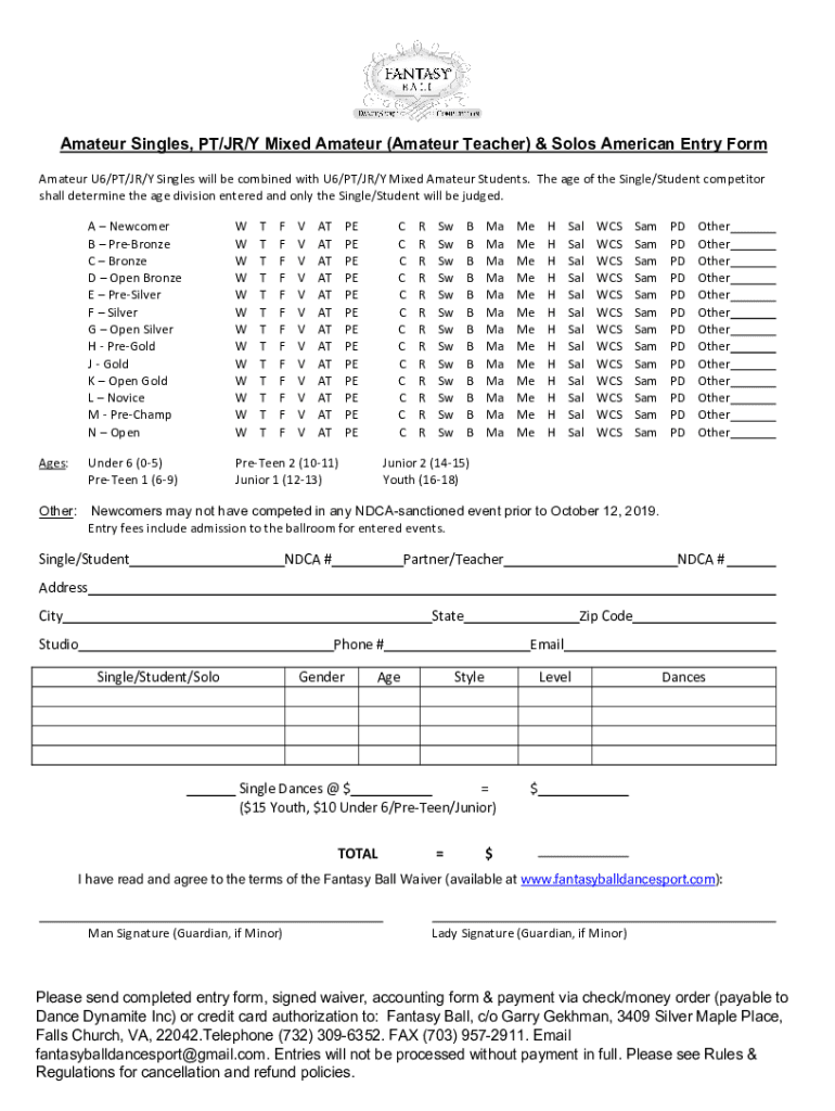 Amateur Singles, PT/JR/Y Mixed Amateur (Amateur Teacher) & Solos American Entry Form Amateur U6/PT/JR/Y Singles will be combined with U6/PT/JR/Y Mixed Amateur Students. The age of the Single/Student