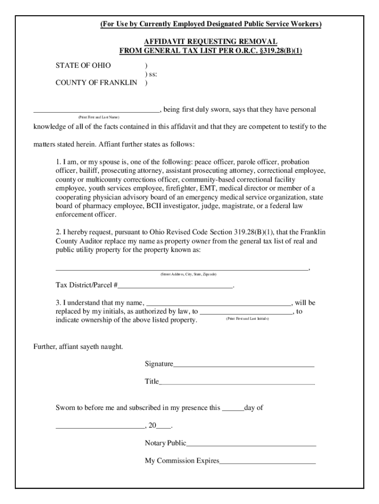 (For Use by Currently Employed Designated Public Service Workers) AFFIDAVIT REQUESTING REMOVAL FROM GENERAL TAX LIST PER O.R.C. 319.28(B)(1) STATE OF OHIO COUNTY OF FRANKLIN)) SS:), being first duly