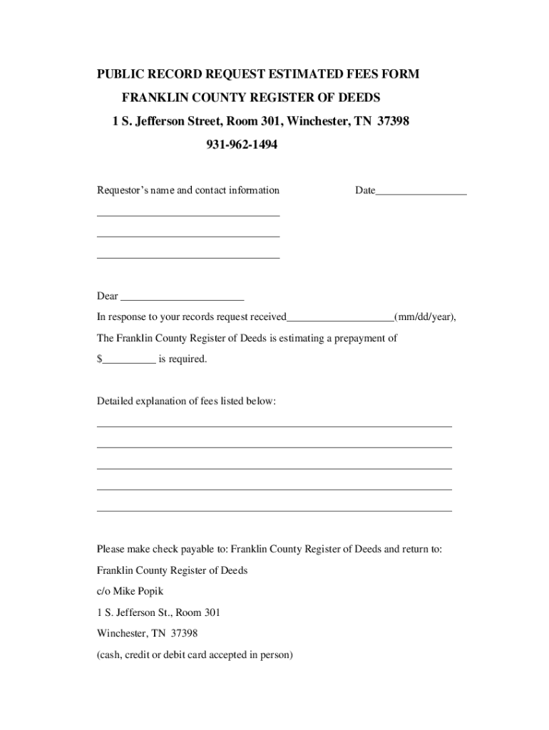 PUBLIC RECORD REQUEST ESTIMATED FEES FORM FRANKLIN COUNTY REGISTER OF DEEDS 1 S. Jefferson Street, Room 301, Winchester, TN 37398 9319621494Requestors name and contact informational Dear In response