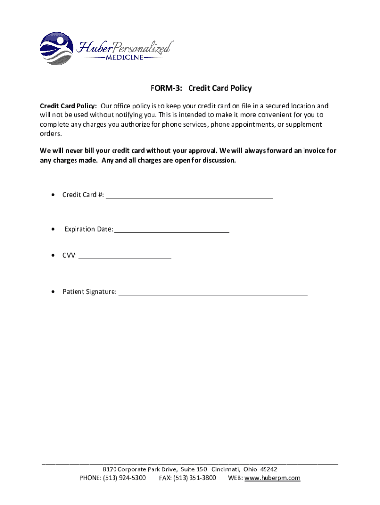 FORM3: Credit Card Policy Credit Card Policy: Our office policy is to keep your credit card on file in a secured location and will not be used without notifying you. This is intended to make it more