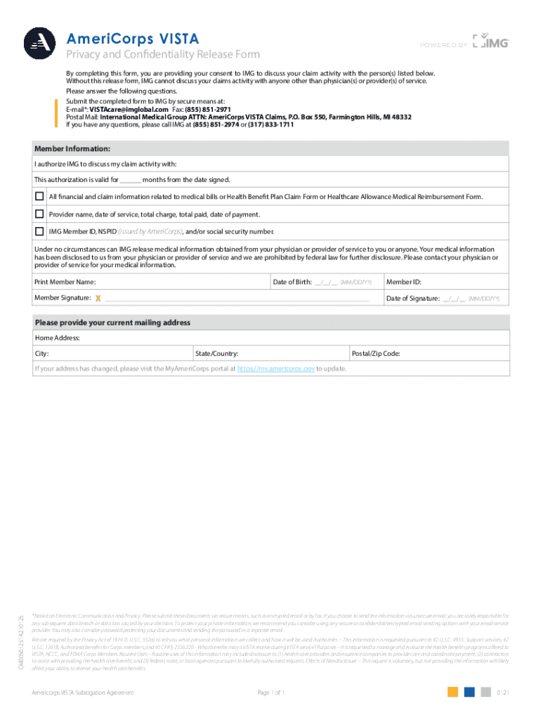 AmeriCorps DISEMPOWERED Privacy and Confidentiality Release Form completing this form, you are providing your consent to IMG to discuss your claim activity with the person(s) listed below. Without