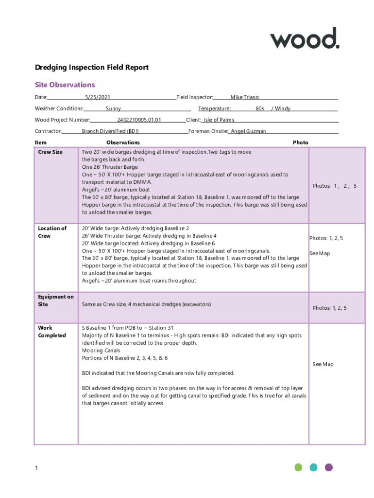 Dredging Inspection Field Report Site Observations Date:5/25/2021Weather Conditions: Wood Project Number: Contractor: Sheffield Inspector:Sunny 2402210005.01.01Branch Diversified (BDI)_Mike TrianoTemperature:80s/