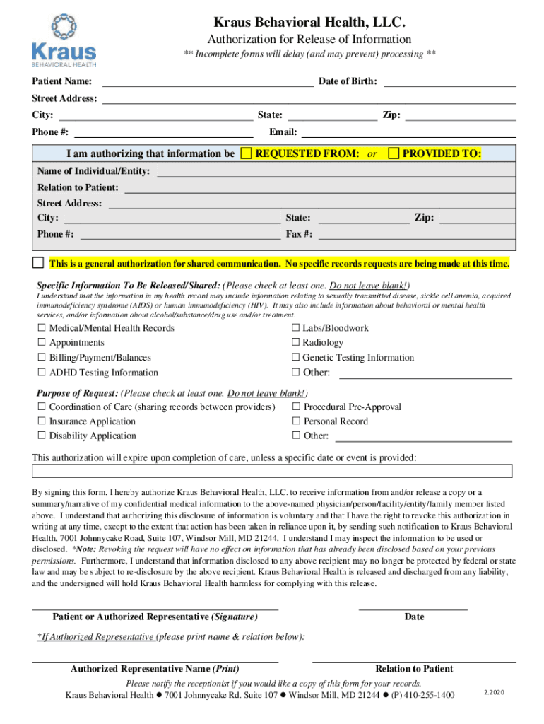 Kraus Behavioral Health, LLC. Authorization for Release of Information ** Incomplete forms will delay (and may prevent) processing ** Patient Name:Date of Birth:Street Address: City:State:Phone #:Zip:Email:I