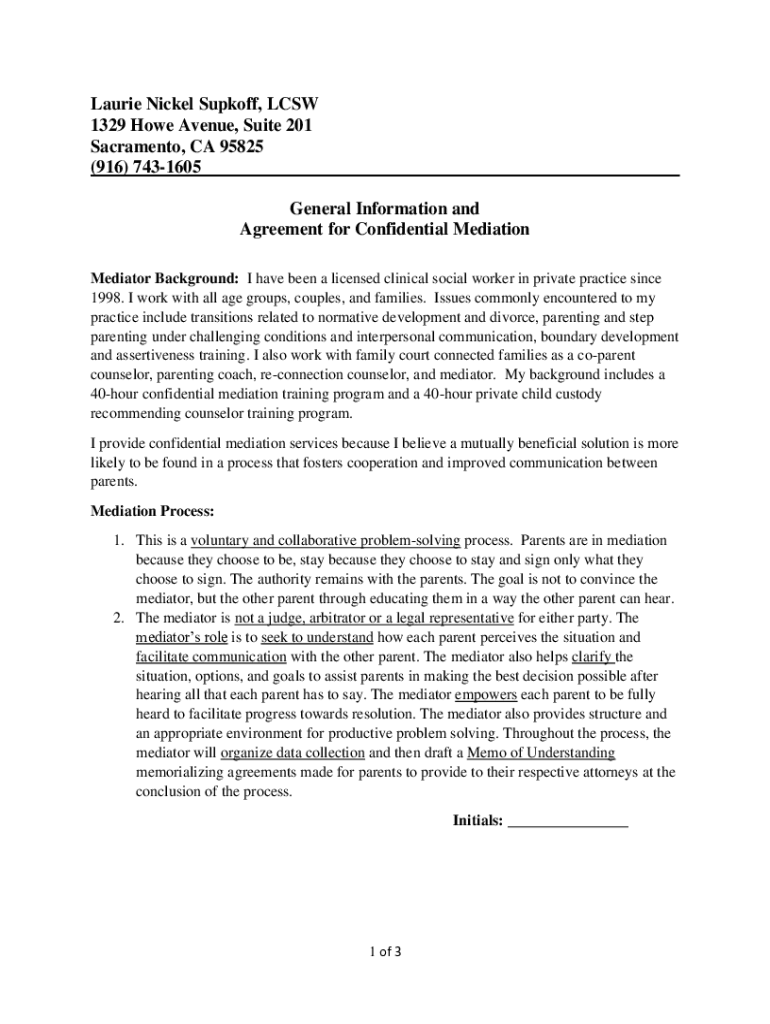 Laurie Nickel Support, LCSW 1329 Howe Avenue, Suite 201 Sacramento, CA 95825 (916) 7431605 General Information and Agreement for Confidential Mediation Mediator Background: I have been a licensed