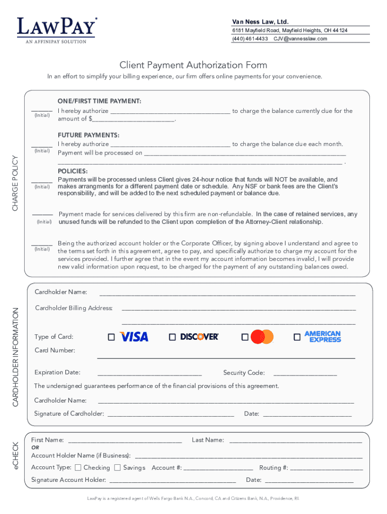 Van Less Law, Ltd. 6181 Mayfield Road, Mayfield Heights, OH 44124 (440) 4614433CJV Vanessa. Complaint *i Authorization Form ivvvLiiiVi vvviiivViiVi ONE/FIRST TIME PAYMENT: IiiLiViiLViVi IVI, * 9(Initial)VF.