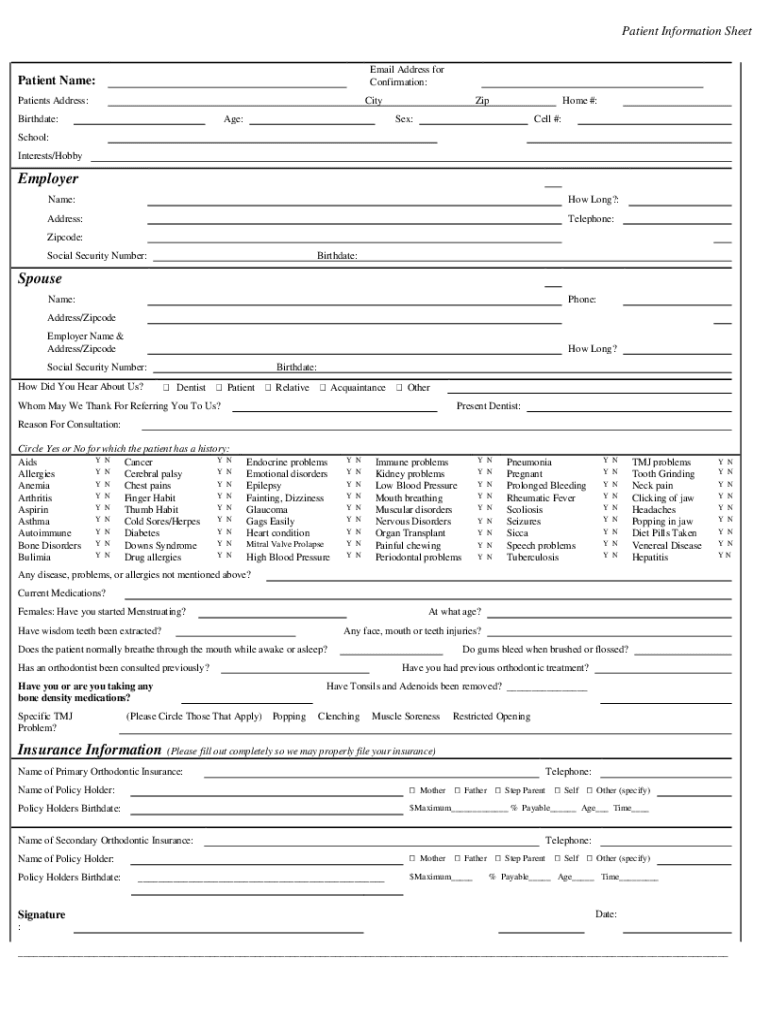 Patient Information Sheet Email Address for Confirmation:Patient Name: Patients Address:CityBirthdate:Age:iPhone #:Sex:Cell #:School: Interests/HobbyEmployer Name:How Long?:Address:Telephone:Zip code: