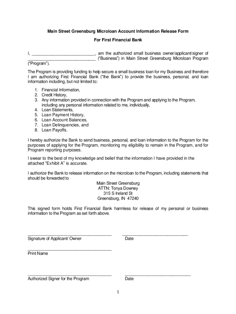 Main Street Greensburg Microloan Account Information Release Form For First Financial Bank I, am the authorized small business owner/applicant/signer of (Business) in Main Street Greensburg Microloan