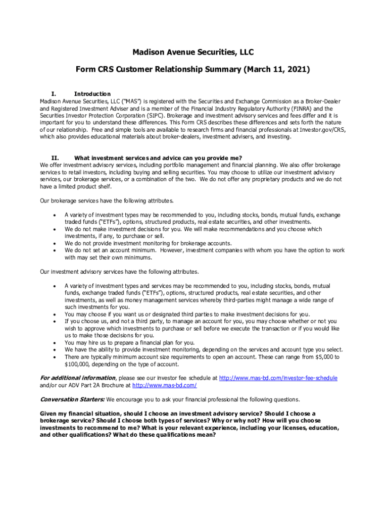 Madison Avenue Securities, LLC Form CRS Customer Relationship Summary (March 11, 2021) I. Introduction Madison Avenue Securities, LLC (MAS) is registered with the Securities and Exchange Commission