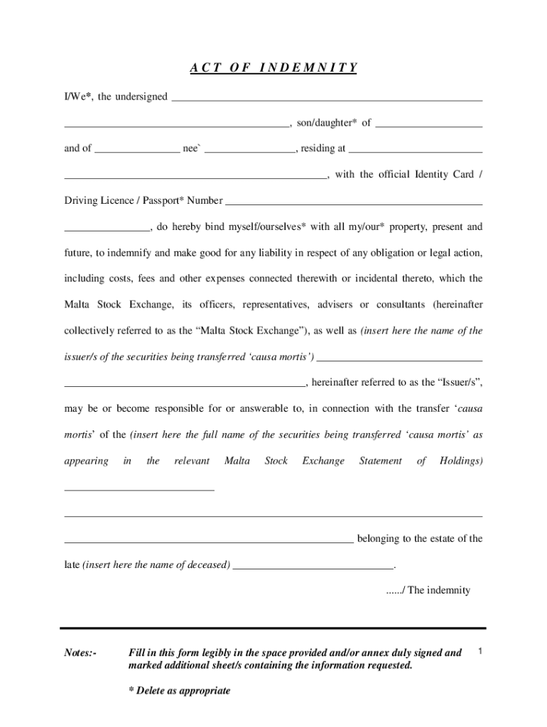 ACT OF INDEMNITY I/We×, the undersigned, son/daughter* of and of née, residing at, with the official Identity Card / Driving License / Passport* Number, do hereby bind myself/ourselves* with all