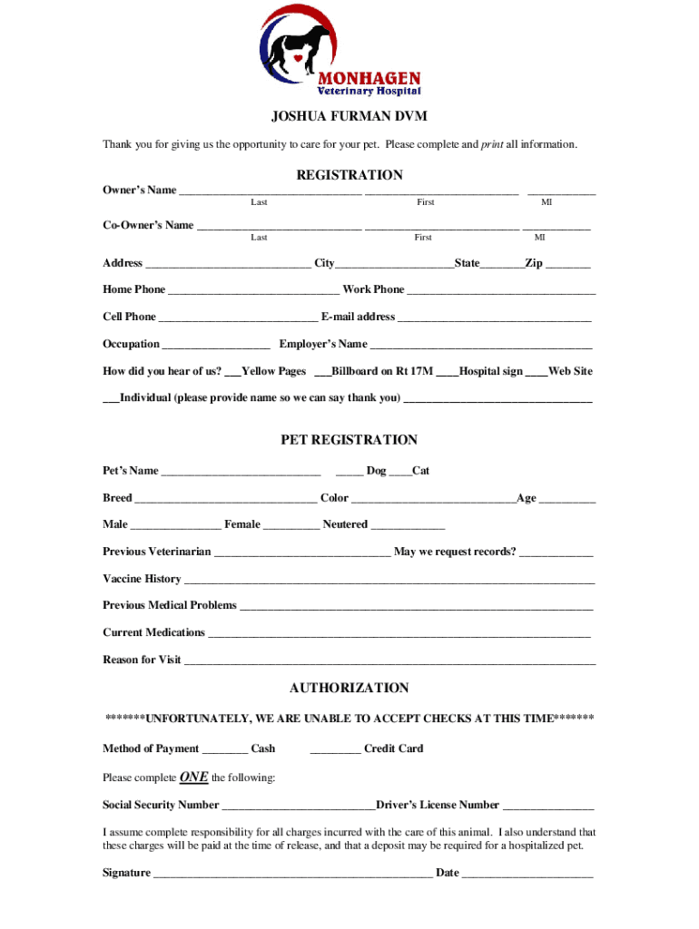 JOSHUA FURMAN DVM Thank you for giving us the opportunity to care for your pet. Please complete and print all information. REGISTRATION Owners Name LastFirstMICoOwners Name LastFirstMIAddress City