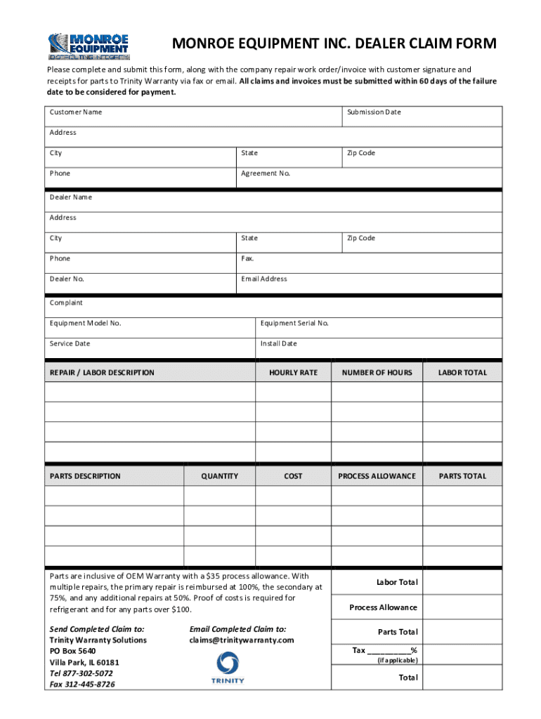 MONROE EQUIPMENT INC. DEALER CLAIM FORM Please complete and submit this form, along with the company repair work order/invoice with customer signature and receipts for parts to Trinity Warranty via