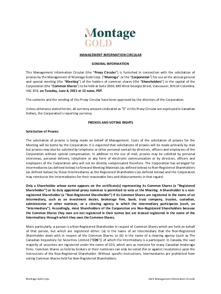 MANAGEMENTINFORMATIONCIRCULAR GENERALINFORMATION This Management Information Circular (the Proxy Circular) is furnished in connection with the solicitation of proxiesbytheManagementofMontageGoldCorp.(MontageortheCorporation)foruseattheannualgeneral