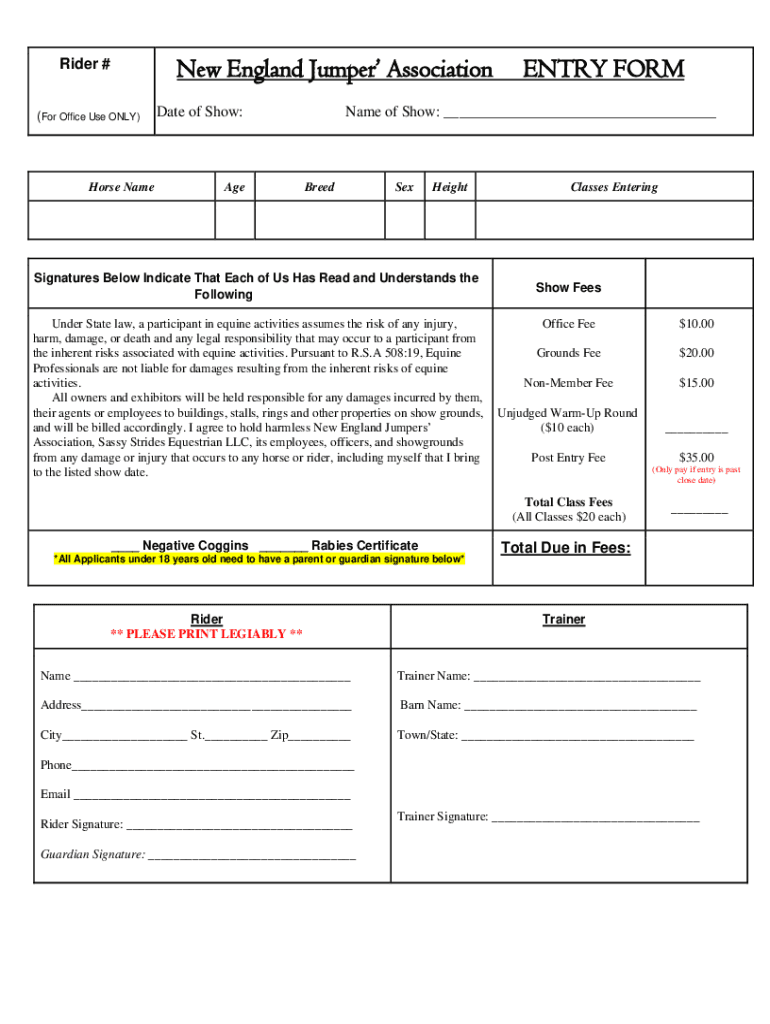 New England Jumper AssociationRider # (For Office Use ONLY)Horse Name Date of Show:Gentry Forename of Show: BreedSexHeightSignatures Below Indicate That Each of Us Has Read and Understands the Following