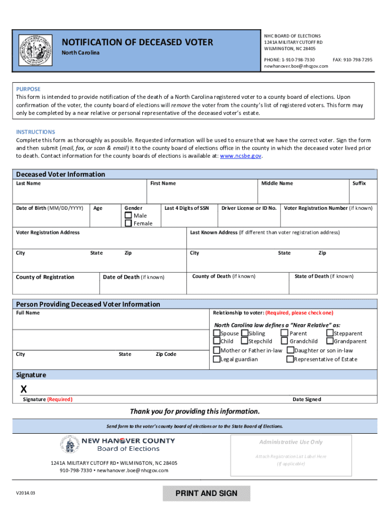 NHC BOARD OF ELECTIONS 1241A MILITARY CUTOFF RD WILMINGTON, NC 28405NOTIFICATION OF DECEASED VOTER North CarolinaPHONE: 19107987330 FAX: 9107987295 newhanover.boe@nhcgov.comPURPOSE This form is intended