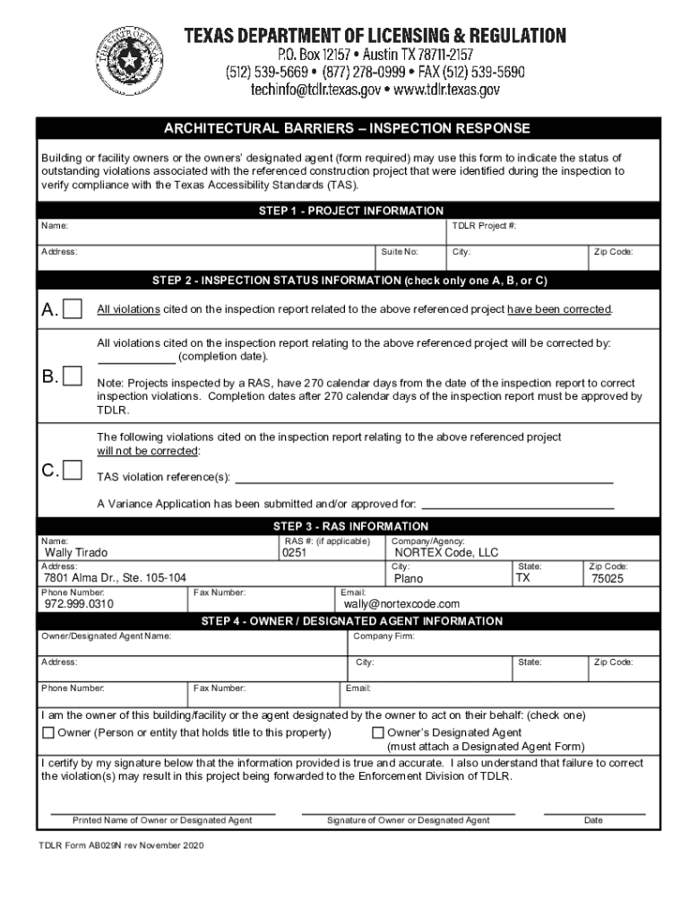 ARCHITECTURAL BARRIERS INSPECTION RESPONSE Building or facility owners or the owners designated agent (form required) may use this form to indicate the status of outstanding violations associated