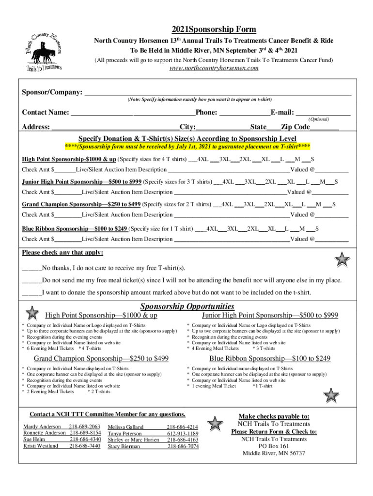 2021Sponsorship Form North Country Horsemen 13th Annual Trails To Treatments Cancer Benefit & Ride To Be Held in Middle River, MN September 3rd & 4th, 2021 (All proceeds will go to support the North
