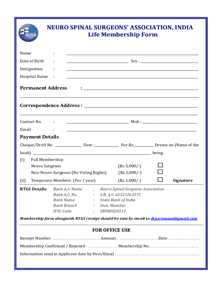 Get the free NEURO SPINAL SURGEONS ASSOCIATION, INDIA Life Membership Form