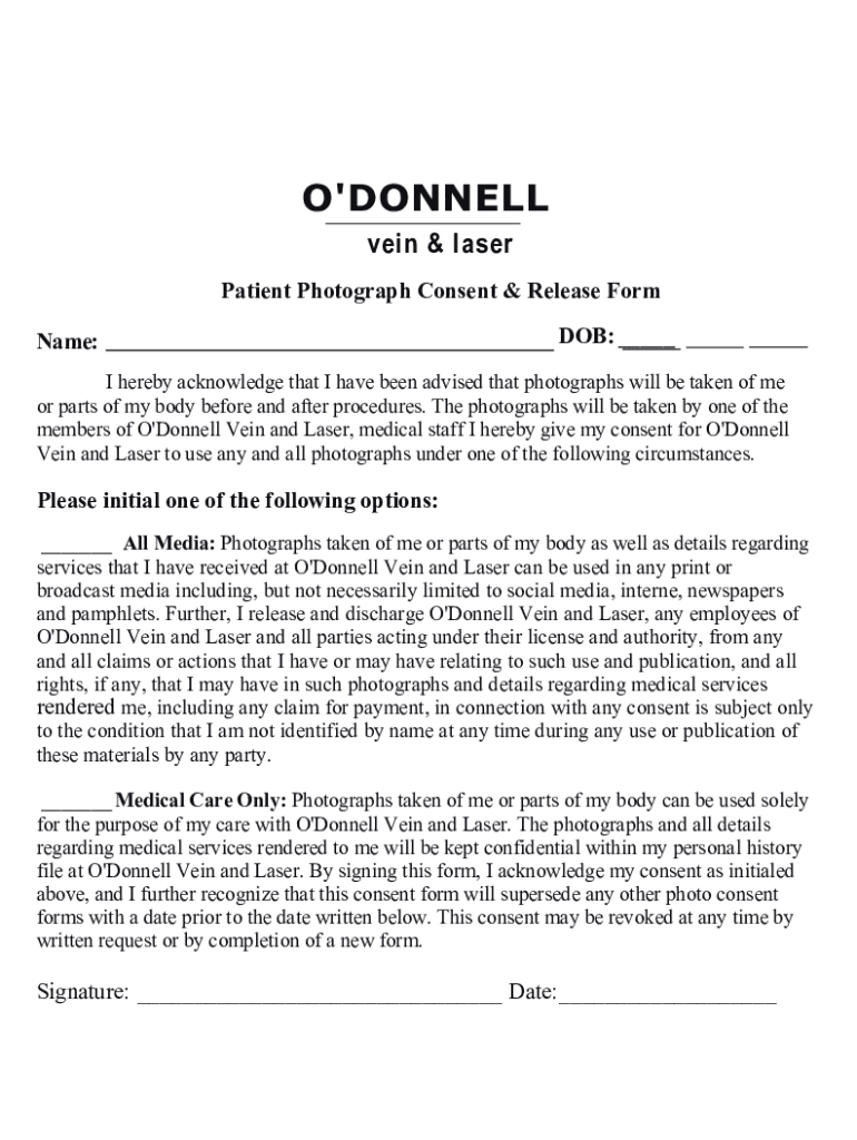 O 'DONNELL vein & laser Patient Photograph Consent & Release Form Name:DOB: I hereby acknowledge that I have been advised that photographs will be taken of me or parts of my body before and after
