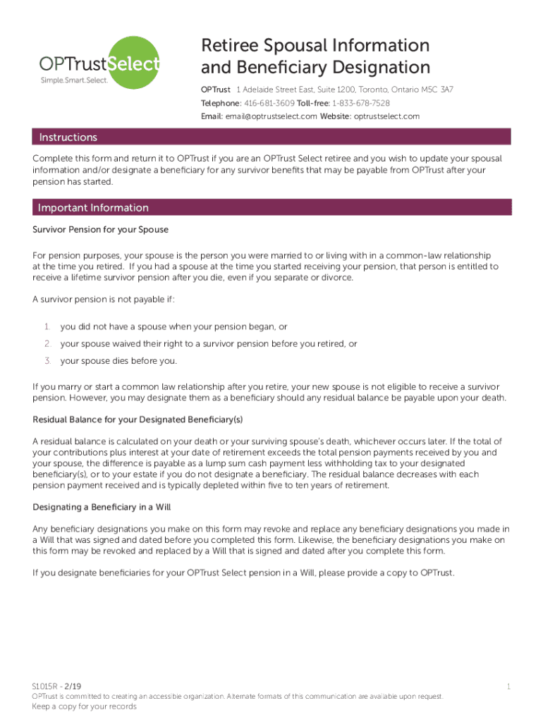 Retiree Spousal Information and Beneficiary Designation OPT rust 1 Adelaide Street East, Suite 1200, Toronto, Ontario M5C 3A7 Telephone: 4166813609 Toll free: 18336787528 Email: email@optrustselect.com