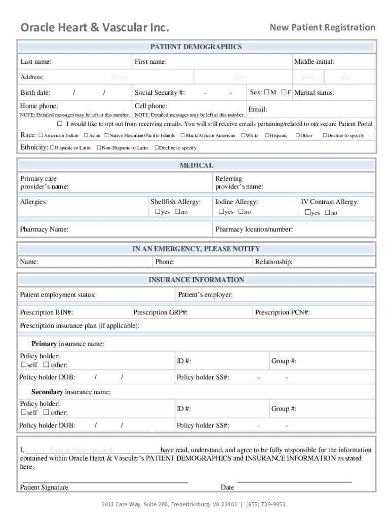 Get the free Oracle Heart & Vascular Inc. New Patient Registration