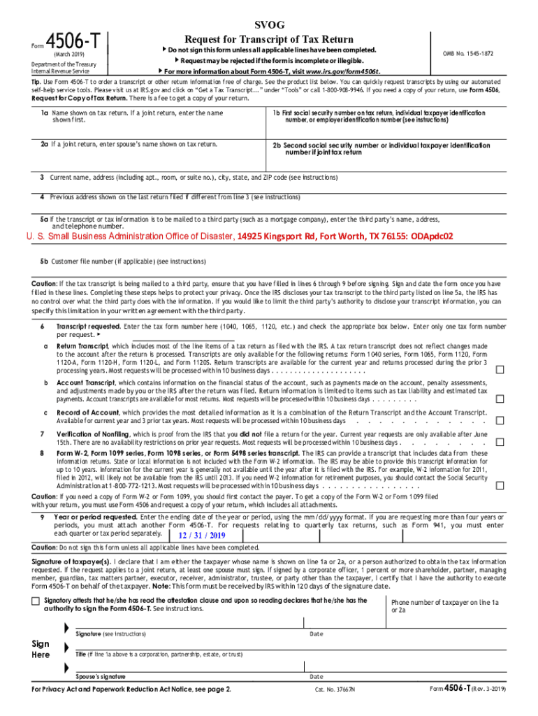 Get the free Form 4506-T (Rev. 3-2019), SVOG Request for Transcript of Tax Return. Request for Tr...