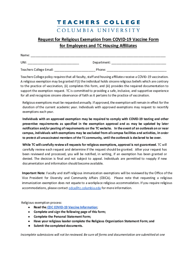 Request for Religious Exemption from COVID-19 Vaccine Form for Employees and TC Housing Affiliates Name: UNI: Department: Teachers College Email: Phone: Teachers College policy requires that all faculty,