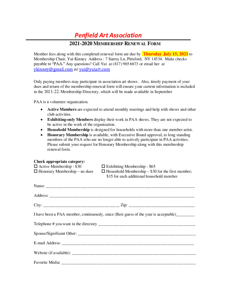 Pen field Art Association 20212020 MEMBERSHIP RENEWAL FORM Member fees along with this completed renewal form are due by Thursday, July 15, 2021, to Membership Chair, Yew Kinney Address : 7 Surrey