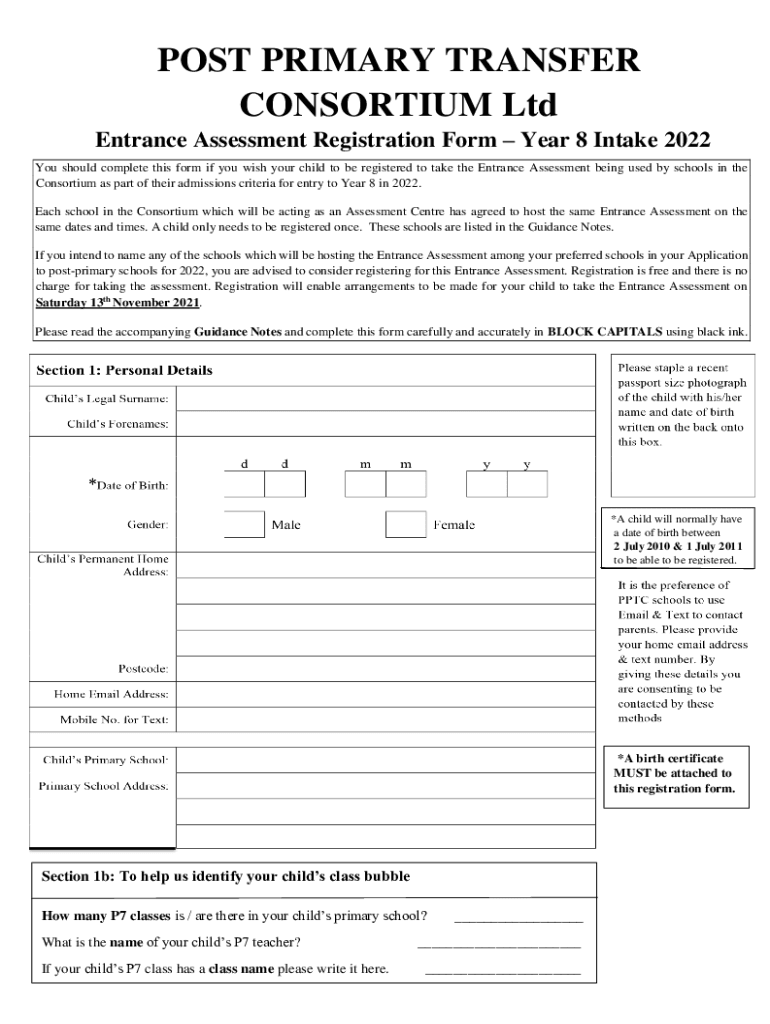 POST PRIMARY TRANSFER CONSORTIUM Ltd Entrance Assessment Registration Form Year 8 Intake 2022 You should complete this form if you wish your child to be registered to take the Entrance Assessment