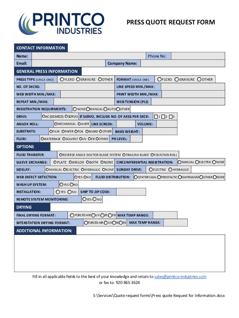 PRESS QUOTE REQUEST RECONTACT INFORMATION Name:Phone No:Email:Company Name:GENERAL PRESS INFORMATION PRESS TYPE (CIRCLE ONE):FLEXOGRAVUREOTHERFORMAT (CHICLE ONE):FLEXING. OF DECKS:LINE SPEED MIN./MAX:WEB