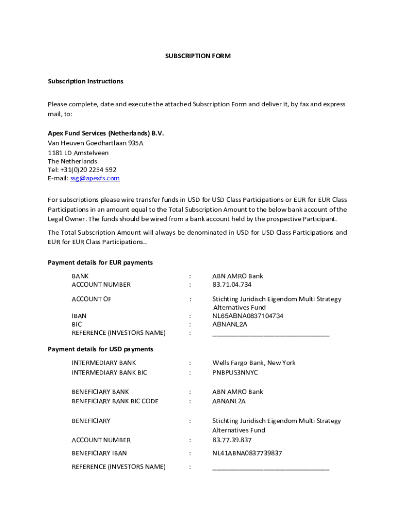 SUBSCRIPTION FORMSubscription Instructions Please complete, date and execute the attached Subscription Form and deliver it, by fax and express mail, to: Apex Fund Services (Netherlands) B.V. Van Heaven
